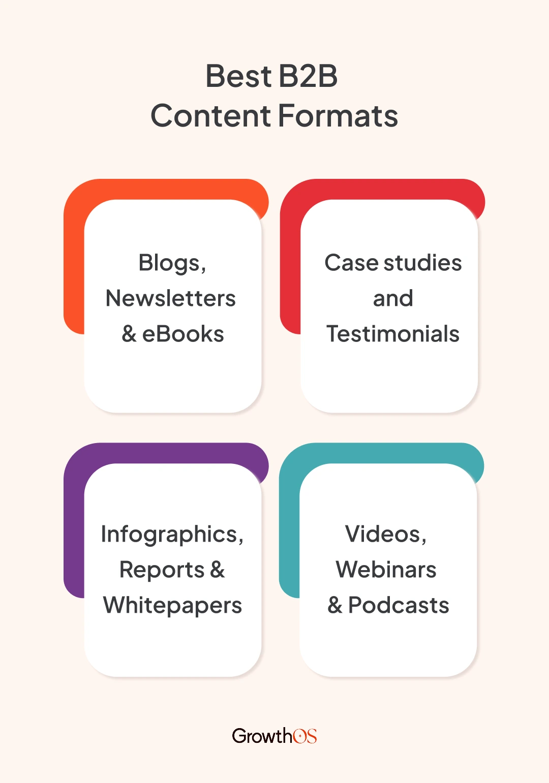 2. Create assets that match how B2B buyers decide: Use blogs for discovery, reports for depth, case studies for proof, and video or webinars to reduce learning friction.