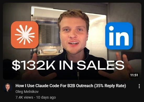 For example, check the thumbnail by Oleg Melnikov; his video’s title is “How I Use Claude Code For B2B Outreach (35% Reply Rate)," but he hasn’t reflected any of that literally in the thumbnail design or text. Instead, he just wrote $132K in Sales with 2 icons: Claude and LinkedIn suggesting he used two tools to do the outreach. This combination creates the curiosity gap.
